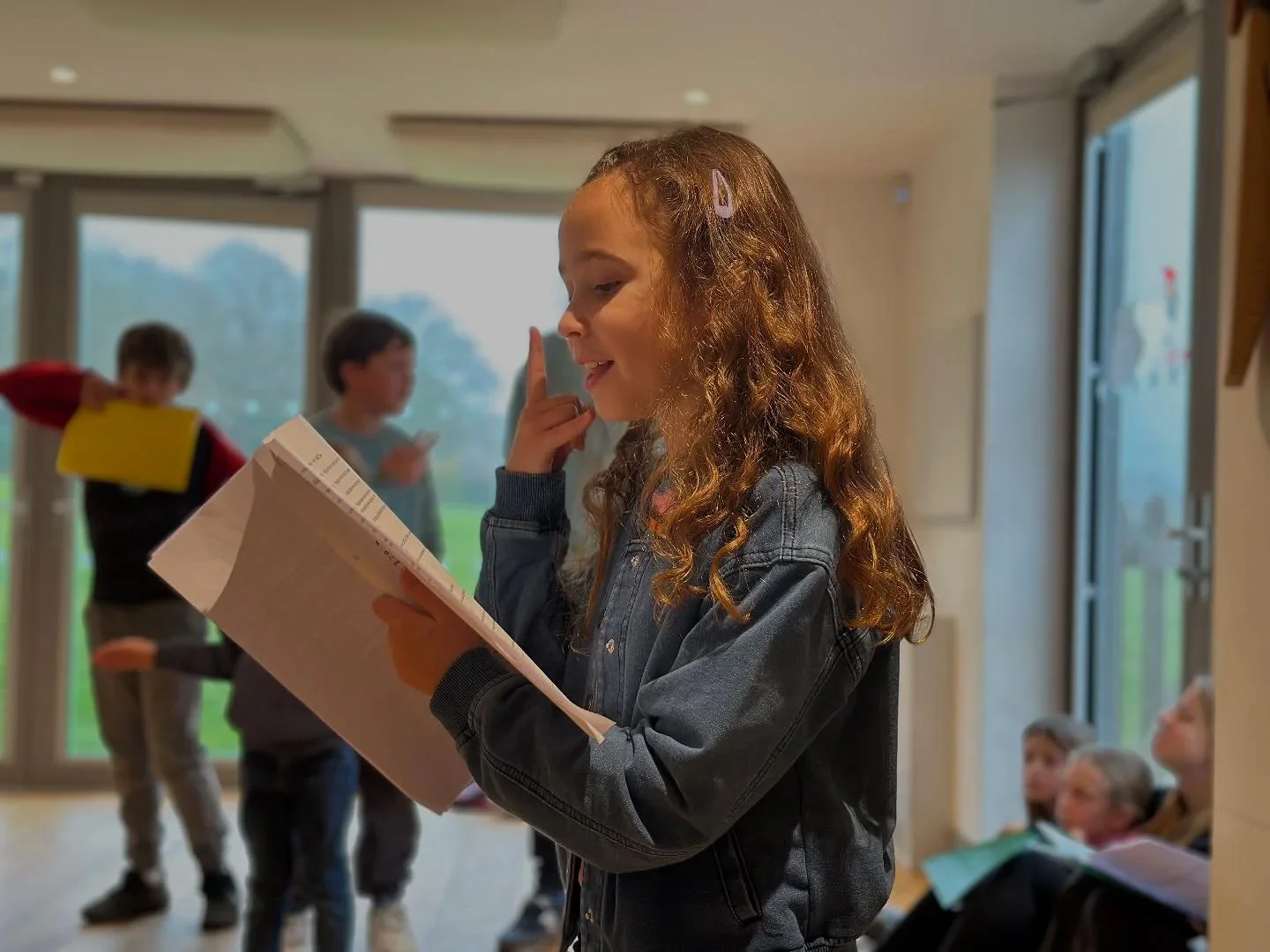 A girl with curly red hair, wearing a denim jacket, reading a book in a classroom. In the background, three boys are standing and talking near large windows, and two younger children are sitting on the floor looking up.